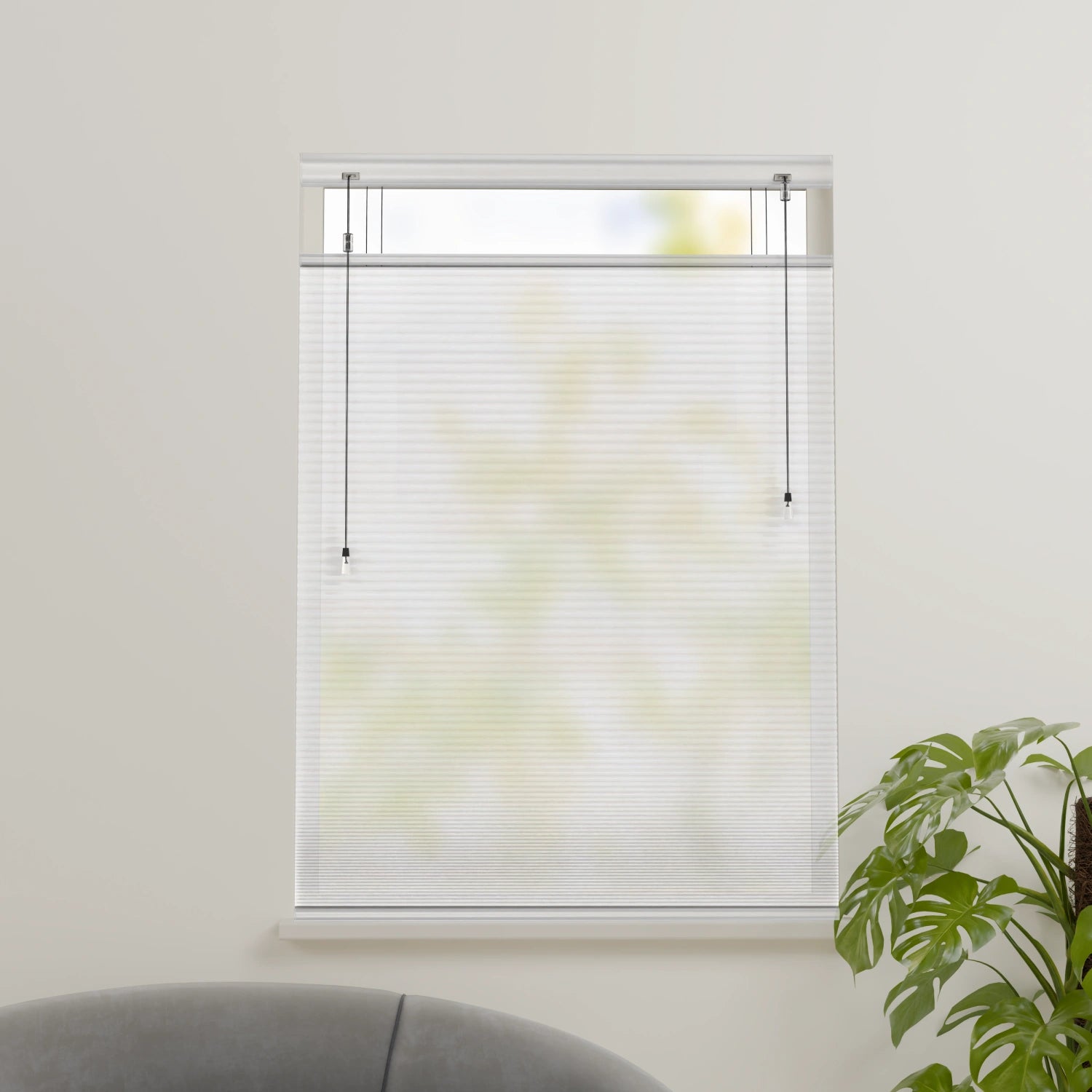 Onze plissé gordijnen kunnen worden besteldmet het gebruiksvriendelijke Top Down Bottom Up systeem. Dit unieke mechanisme biedt maximale controle over lichtinval en privacy. Aan de hand van de twee koordbedieningen kun je de onderkant omhoog trekken en de bovenkant omlaag, zodat je het licht precies daar binnenlaat waar jij het nodig hebt. Ideaal voor ramen met een prachtig uitzicht, terwijl je tegelijkertijd ongewenste inkijk voorkomt.